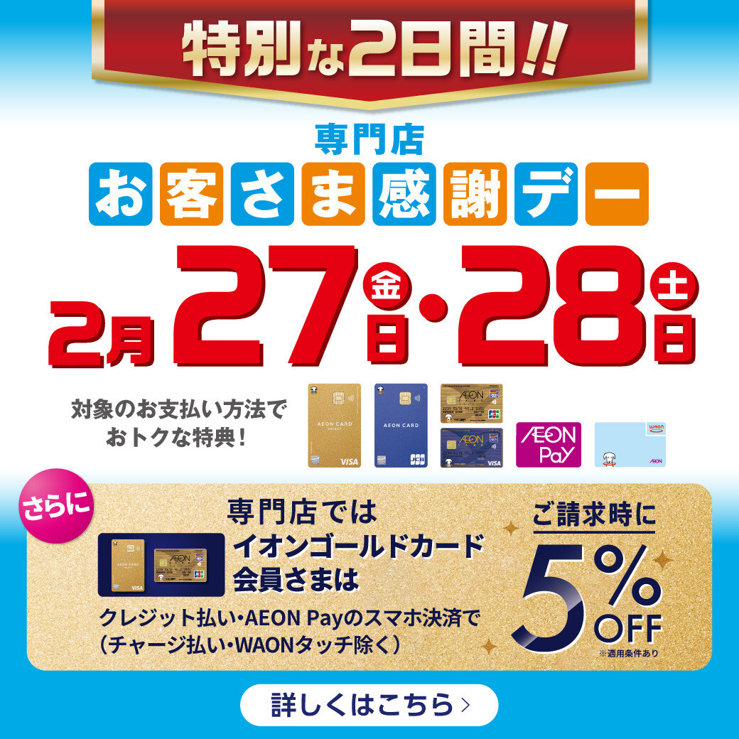 毎月20日・30日はお客さま感謝デー♪ あれ・・・2月は30日が無い!お客さま感謝デーはいつ開催されるの・・・? 2月は2月27日(金)・28日(土)と連続で感謝デーを開催いたします。 ということは! 2月は特別に20日(金)・27日(金)・28日(土)の3日間開催‼ 各種イオンマークのカードのクレジットでのお支払い、AEON Payまたは電子マネー WAONでのお支払いで、素敵な特典が盛りだくさん‼ 春のお祝い事や新生活の準備は、ぜひ明石ビブレへお越しください。 ※特典を受けられる対象決済は、ショップにより異なります。 ※一部、実施していない店舗がございます。 ※一部対象外の商品・サービスがございます。 ※他の割引との併用はできません。 詳しくは各ショップまでお問い合わせください。 ※サービス内容、詳細は変更になる場合がございます。 \同時開催!/ ゴールドカード請求時5%OFF イオンゴールドカードのクレジット払い・AEON Pay決済(チャージ払い・WAONタッチは除く)をご利用でご請求時に5%OFF!!