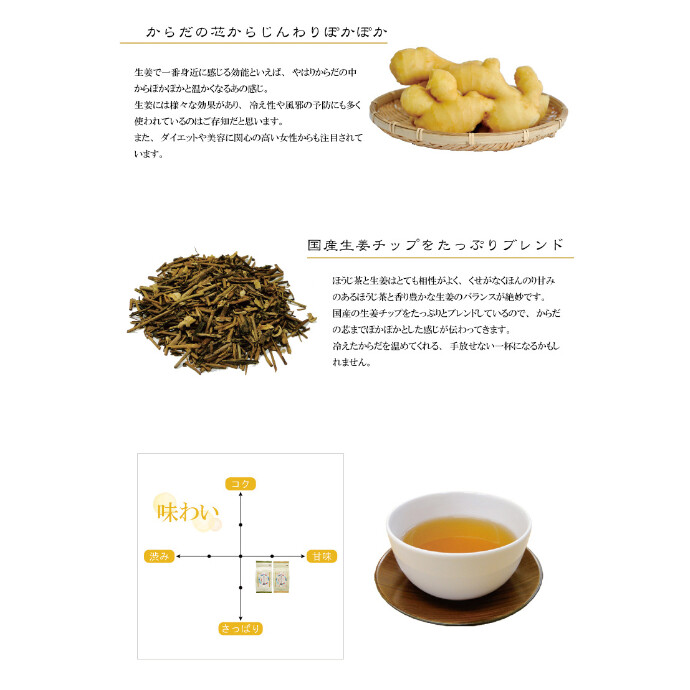 くせがなく甘みのある焙茶に香り豊かな生姜がバランスよく配合されています。