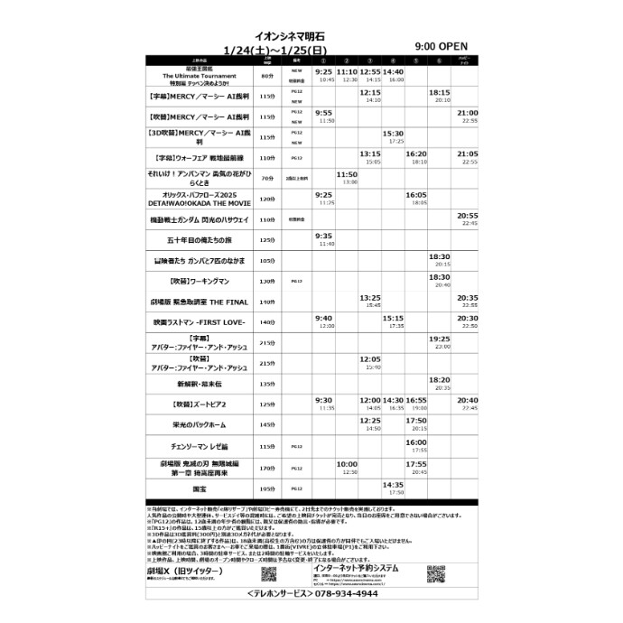 1/23(金)~1/29(木)のスケジュール 新規公開作品 ・MERCY/マーシー AI裁判 2D字幕・2D吹替・3D吹替 ・最強王図鑑 The Ultimate Tournament 特別編 テッペン決めようか!