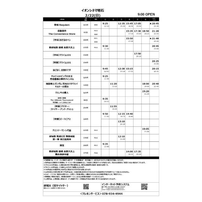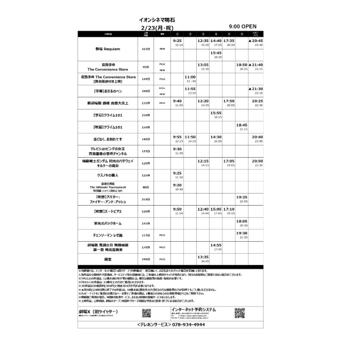 2/20(金)~2/20(木)のスケジュール 新規公開作品 ・教場 Requiem ・夜勤事件 The Convenience Store ・おさるのベン 字幕版