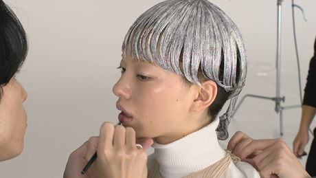 「SPARK」をイメージしラメを施したヘア&メイク。新しいアオイさんを表現するため、透明感を追求したメイクで仕上げました。
